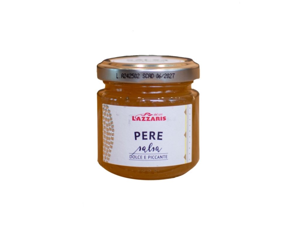 Lazzaris Salsa di Pere je charakteristická italská sladko-pikantní ovocná omáčka z kandovaných hrušek s jemným aromatem senape (hořčice). Díky plné chuti a ideální konzistenci je tato hrušková salsa perfektní k vyzrálým sýrům, jako jsou Grana Padano DOP nebo Parmigiano Reggiano DOP, ale také k tučnějším masům a zvěřině, kde dodá pokrmu příjemný kontrast sladkosti a kořenitosti.
